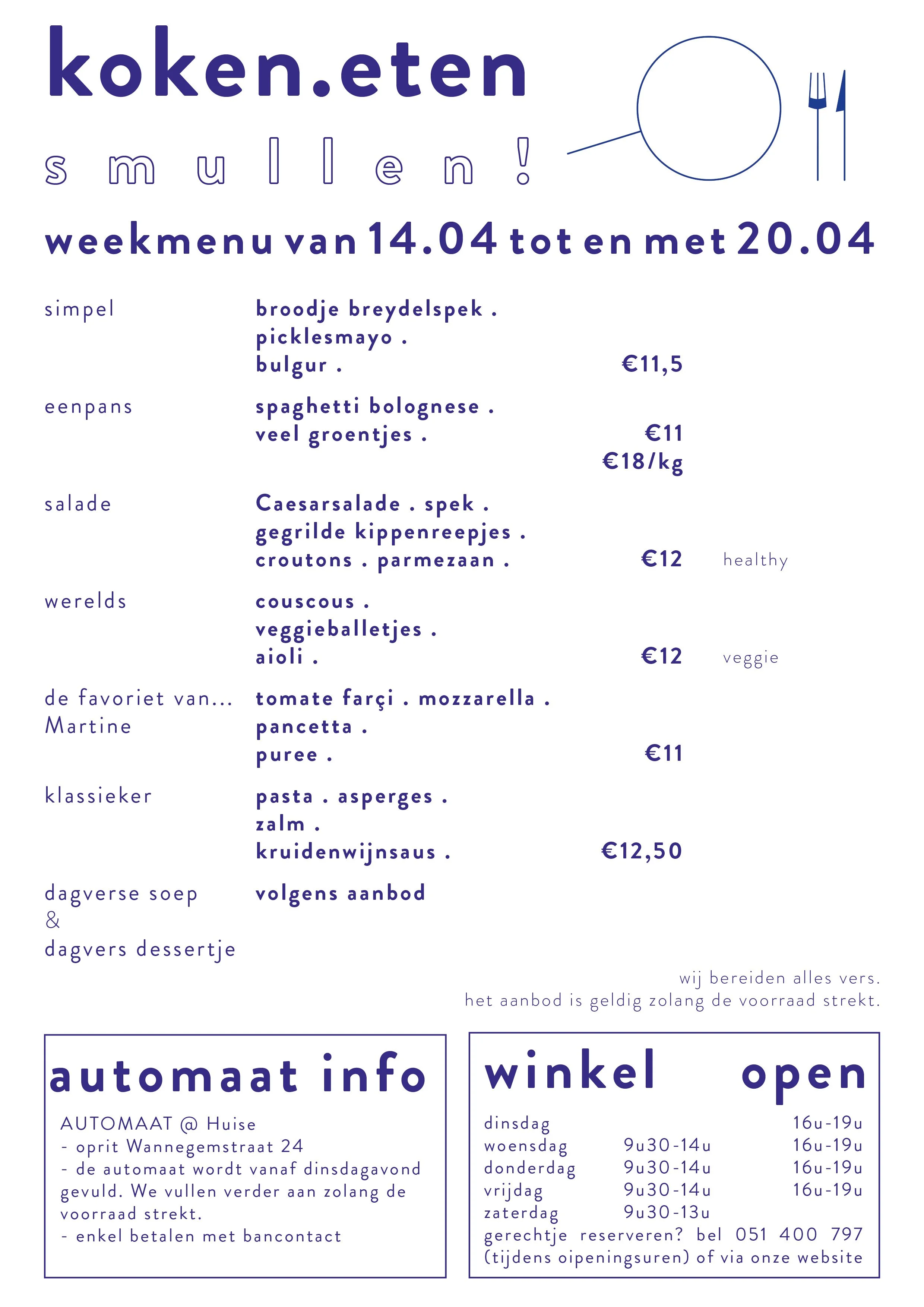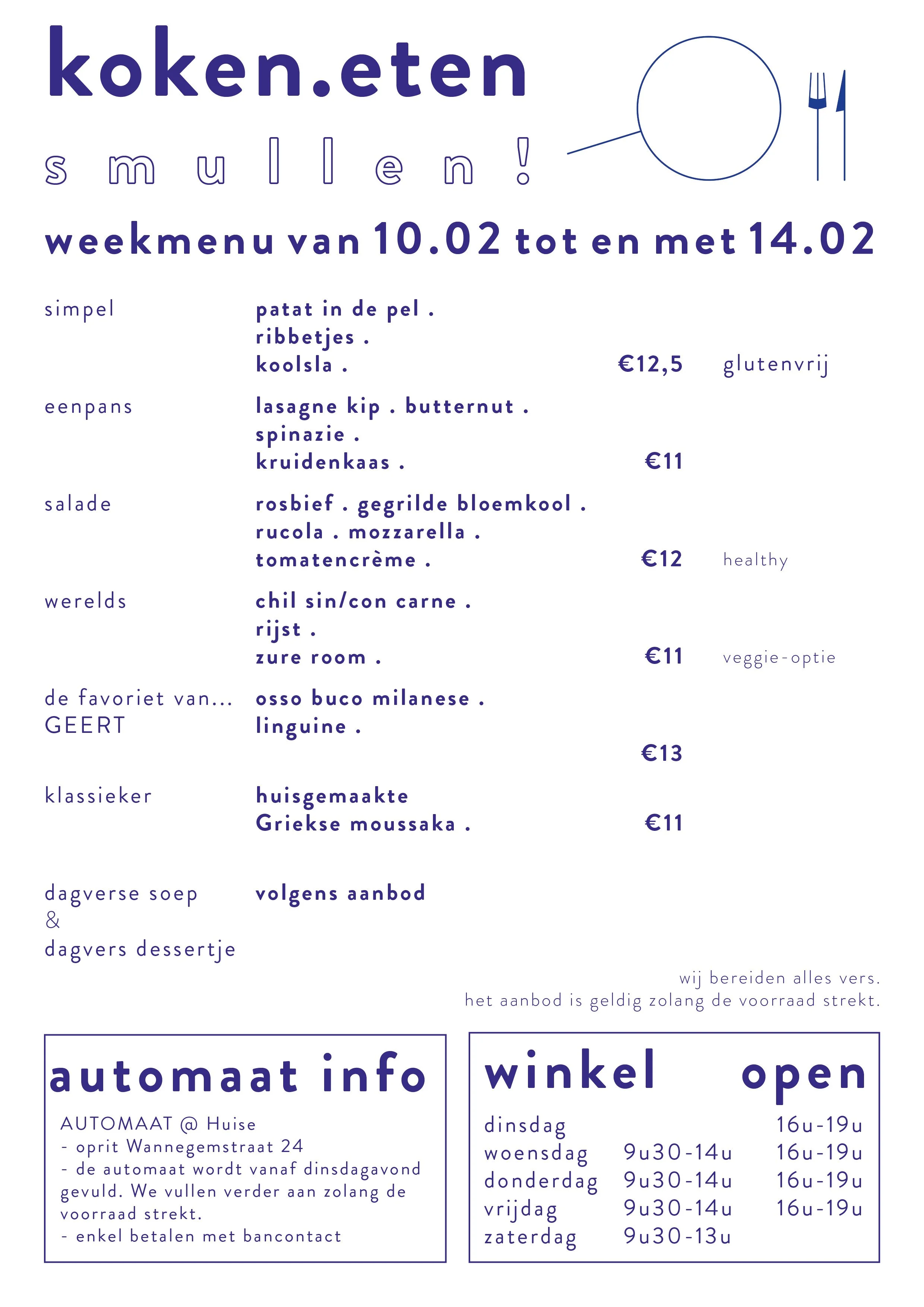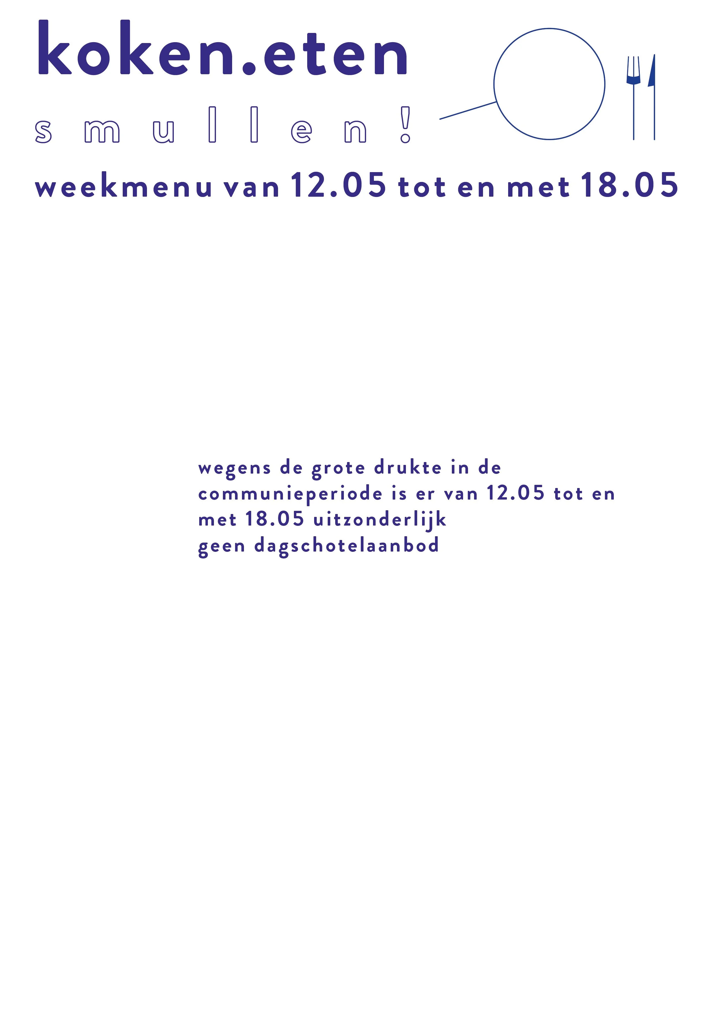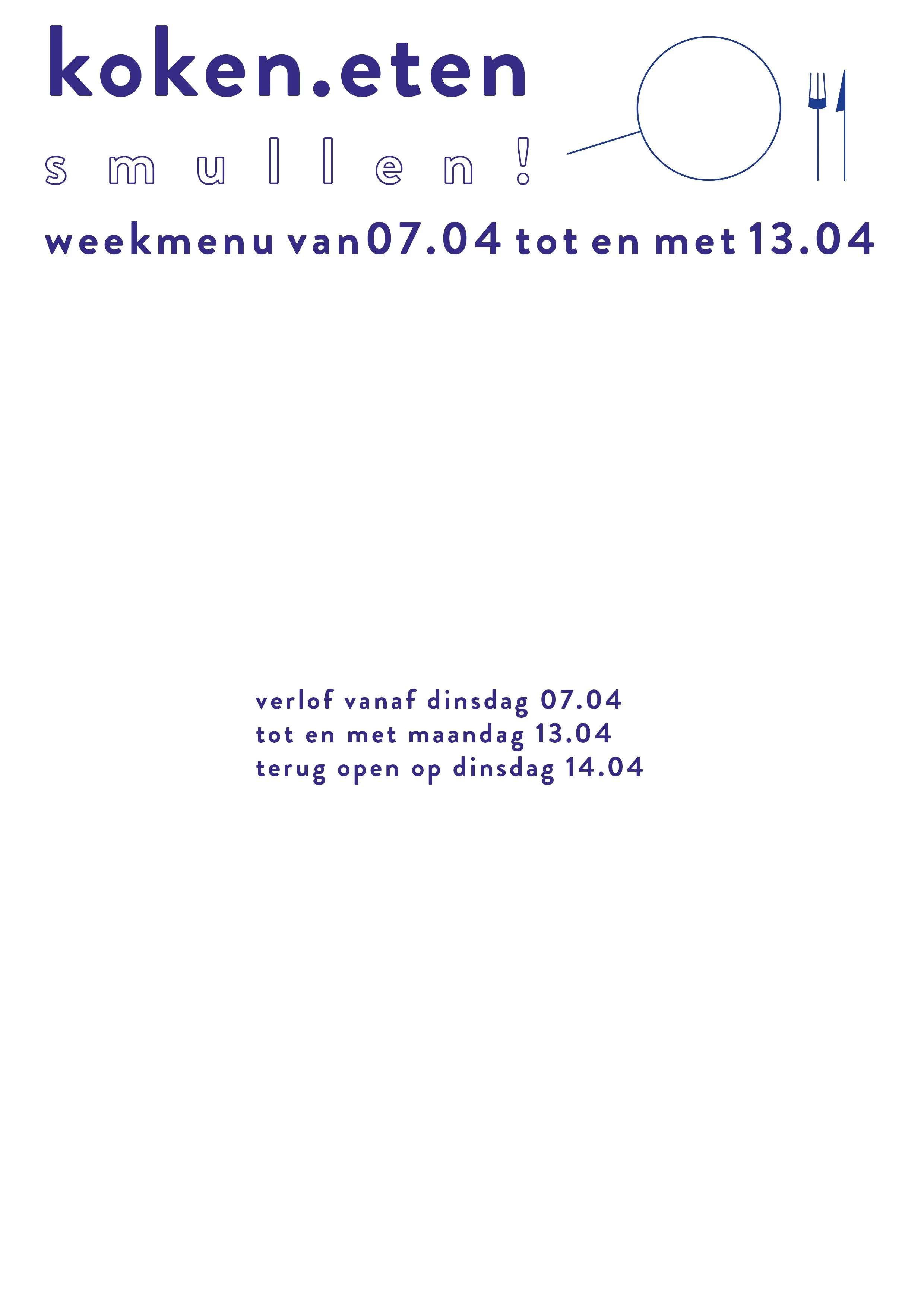We maken van dinsdag tot en met zaterdag 6 verschillende gerechten die dagvers worden aangevuld met soep en dessertjes. Wij staan er om bekend om op maat van de klant te werken. Wij houden dus graag rekening met allergenen en dieetvoorschriften (tijdig laten weten).