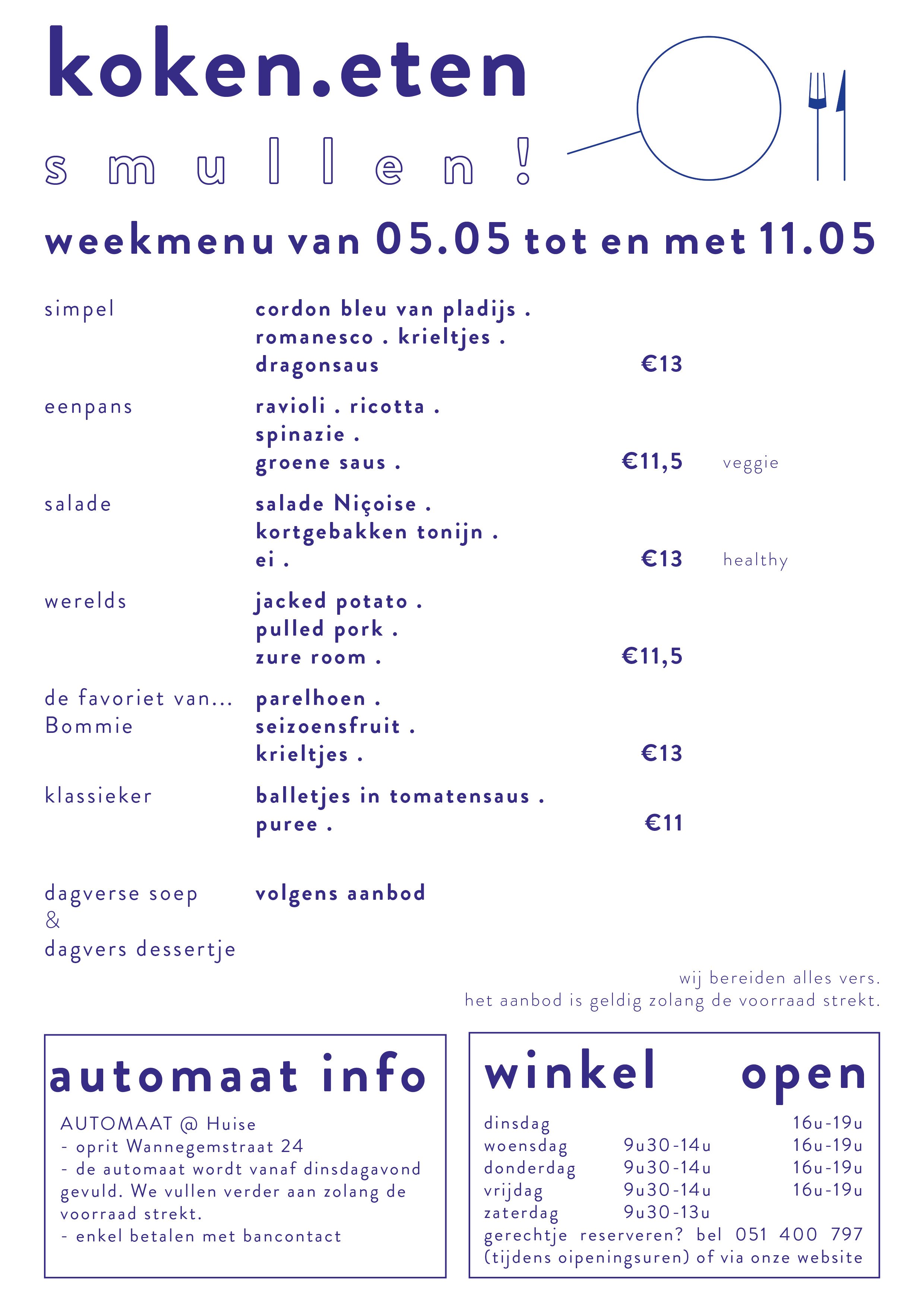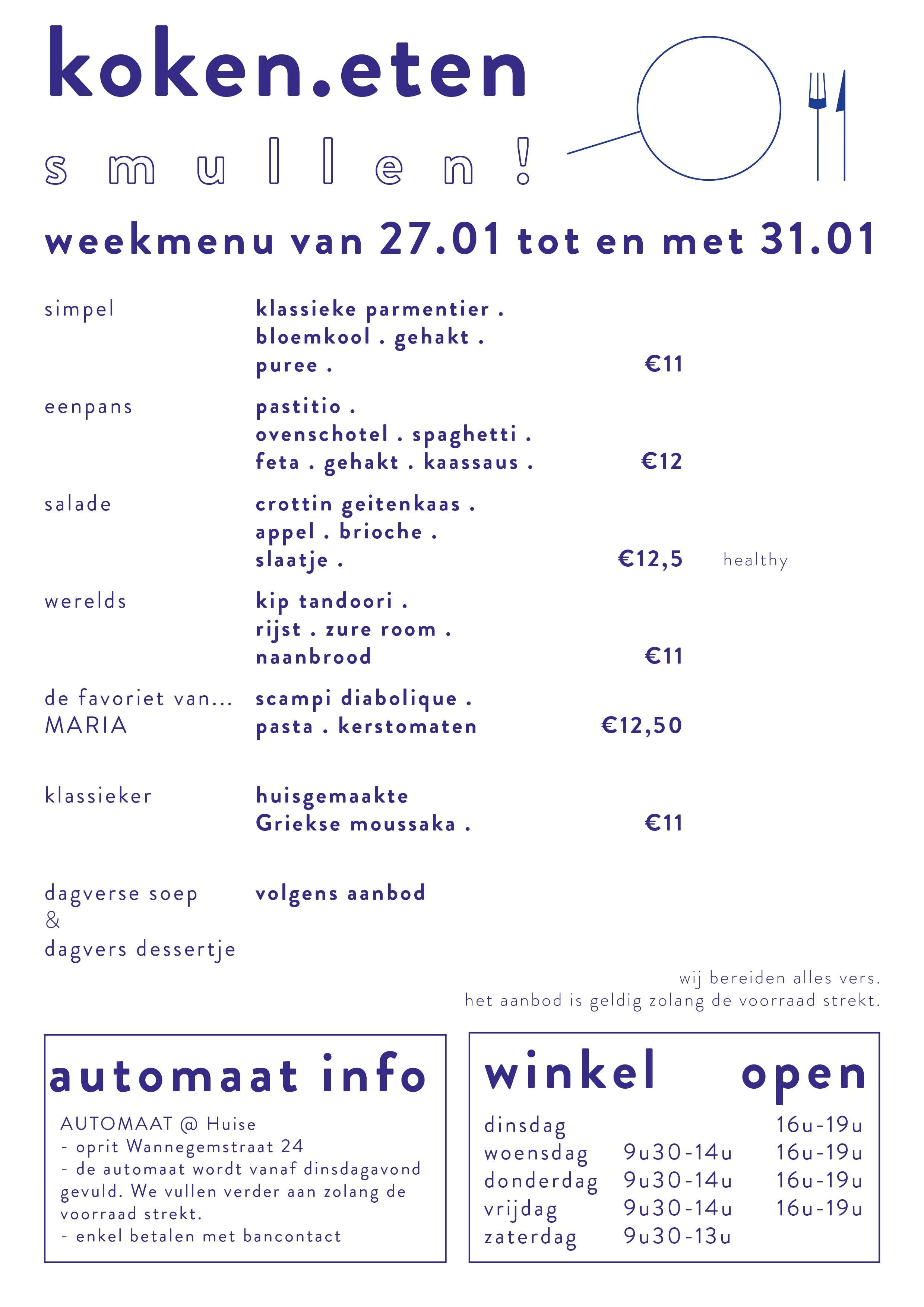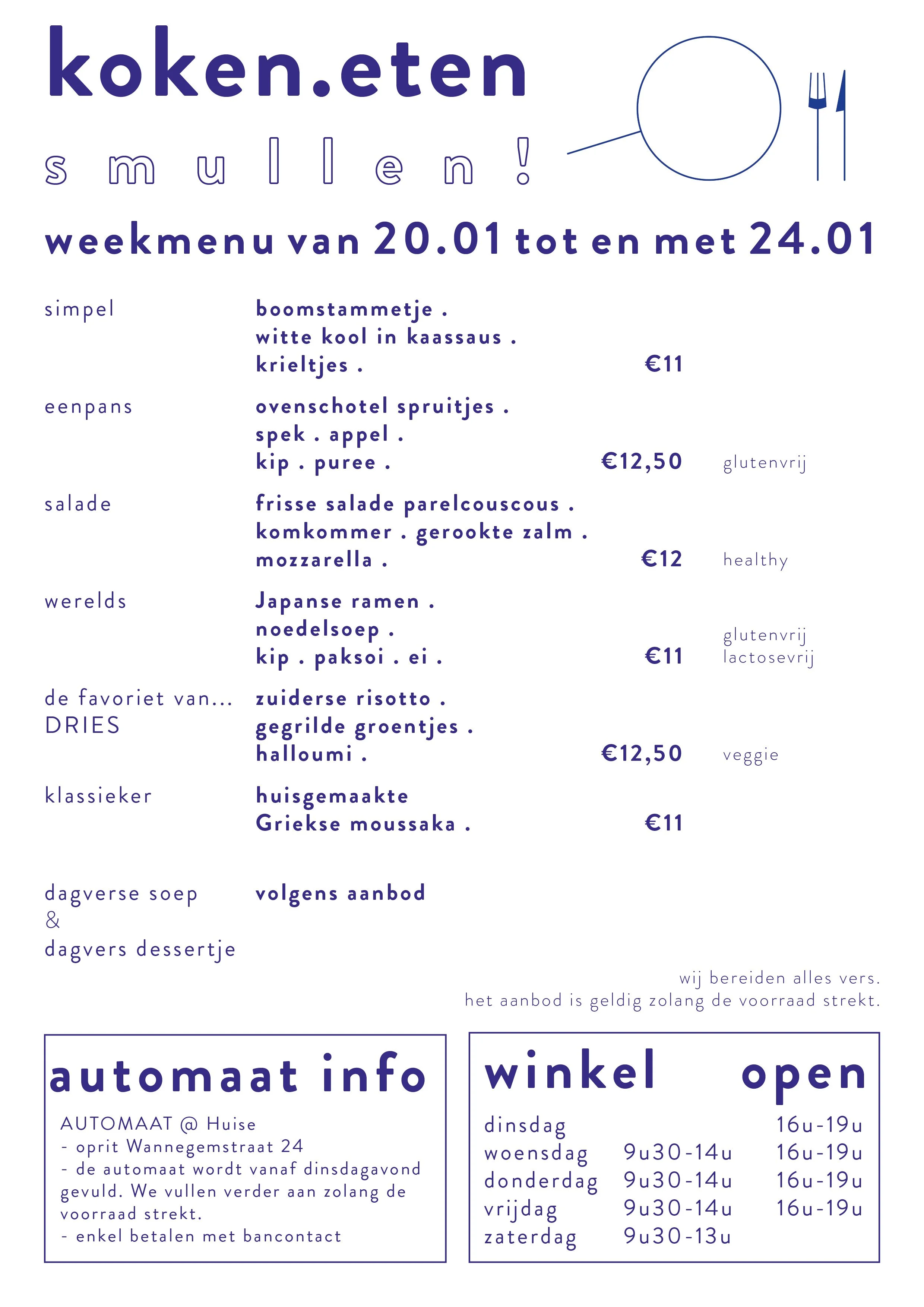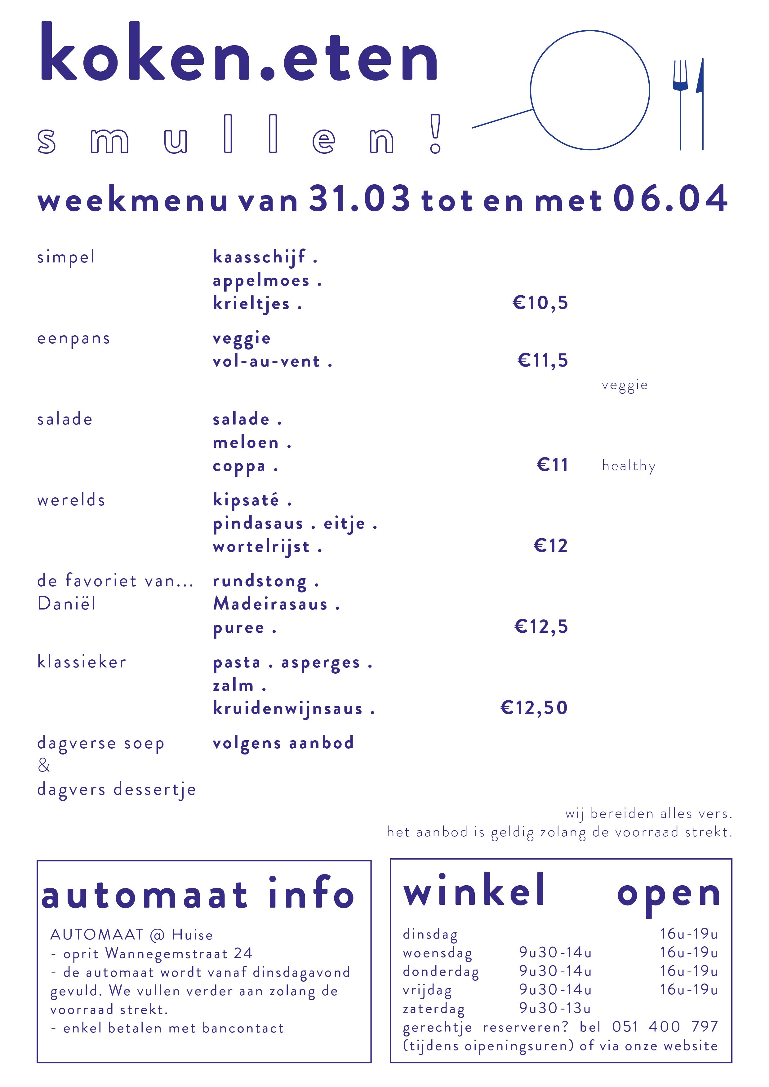 We maken van dinsdag tot en met zaterdag 6 verschillende gerechten die dagvers worden aangevuld met soep en dessertjes. Wij staan er om bekend om op maat van de klant te werken. Wij houden dus graag rekening met allergenen en dieetvoorschriften (tijdig laten weten).