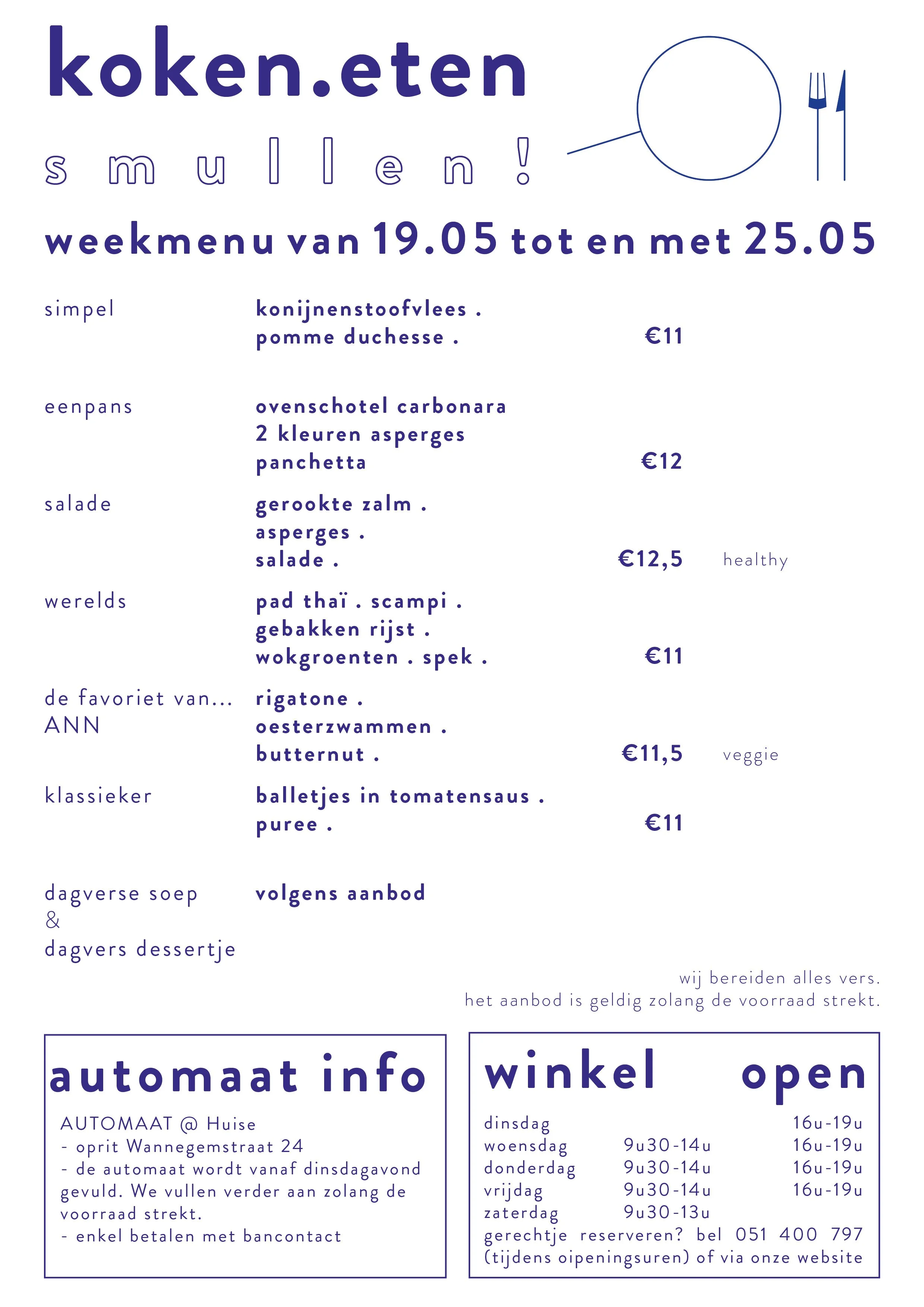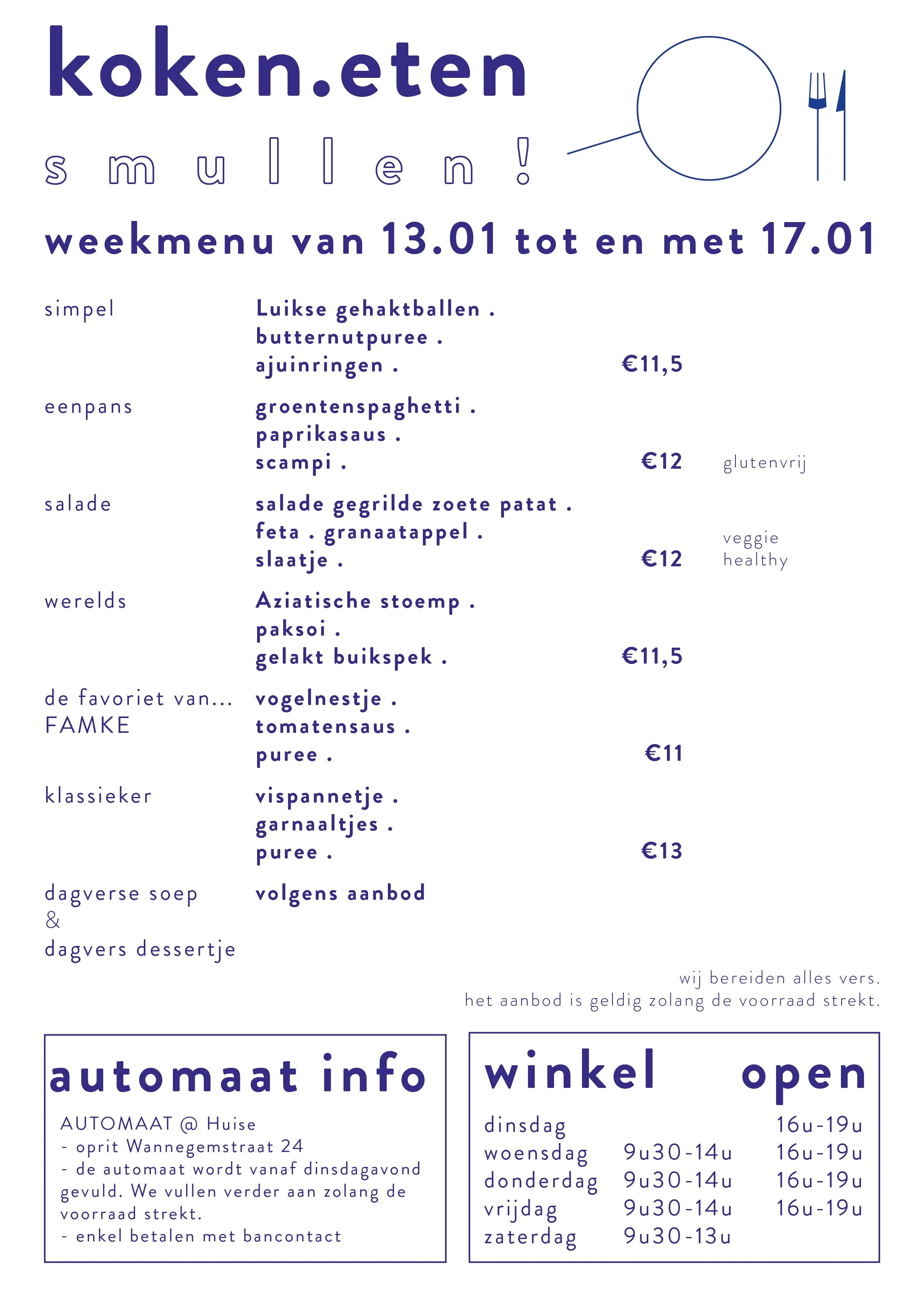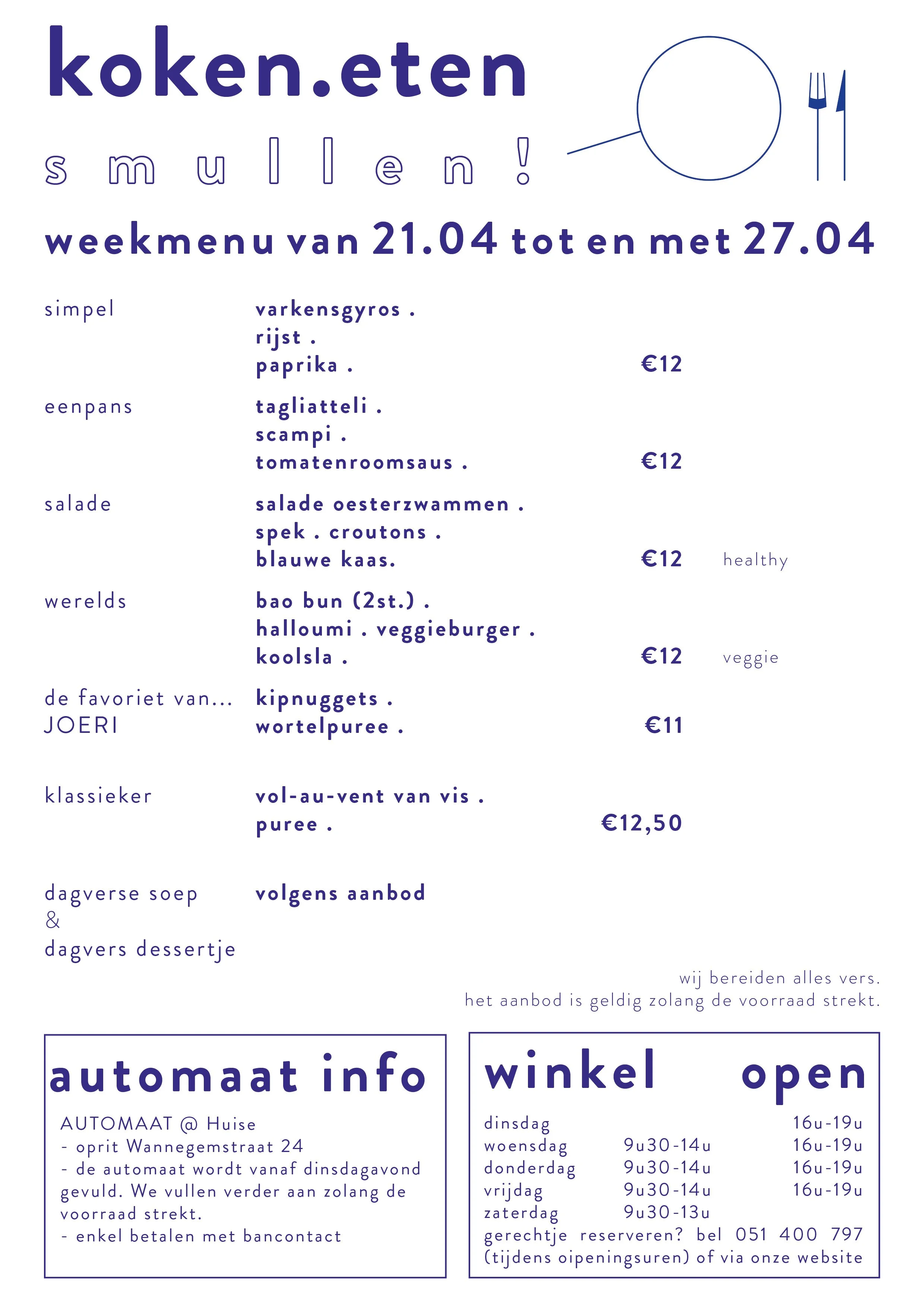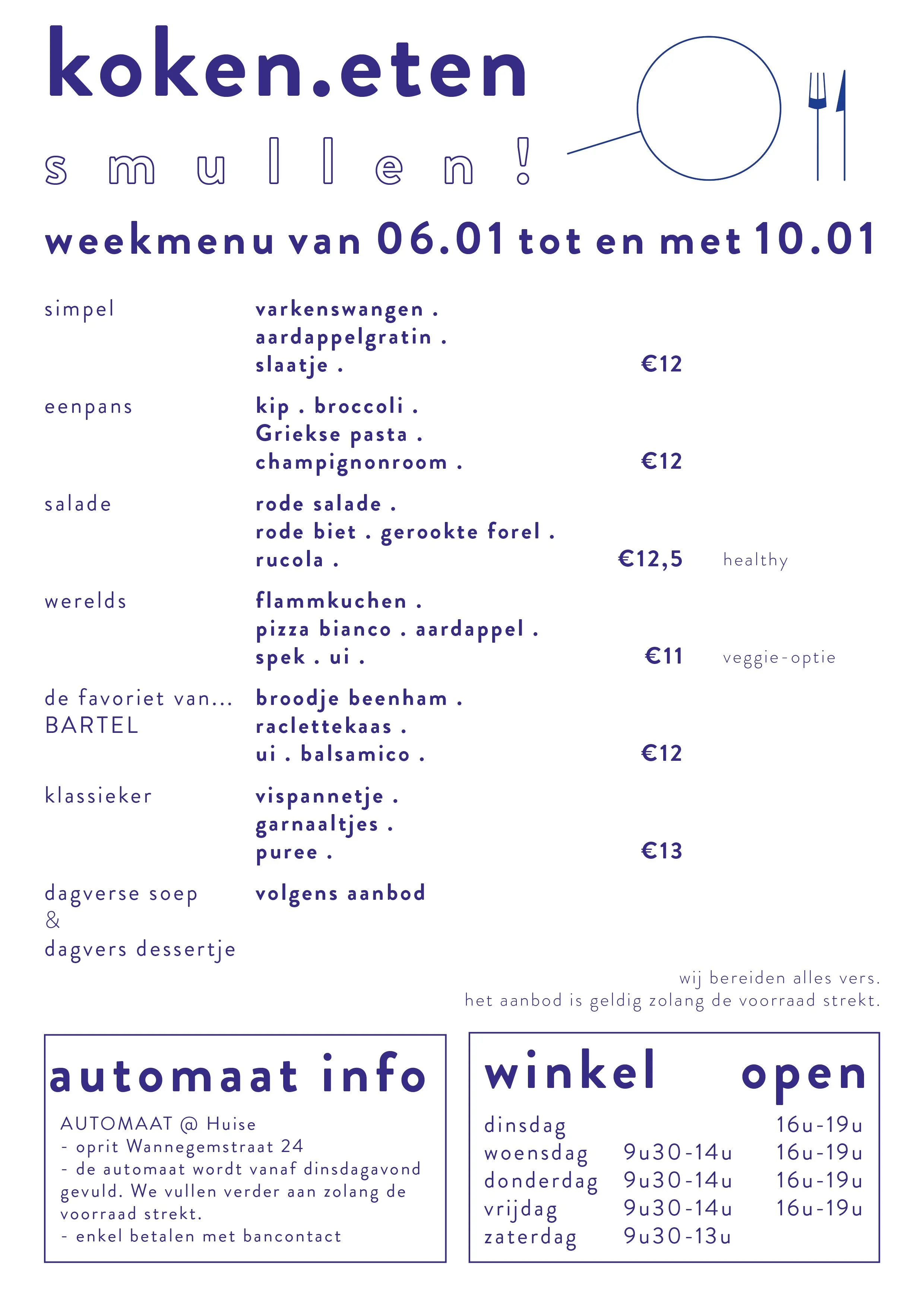 We maken van dinsdag tot en met zaterdag 6 verschillende gerechten die dagvers worden aangevuld met soep en dessertjes. Wij staan er om bekend om op maat van de klant te werken. Wij houden dus graag rekening met allergenen en dieetvoorschriften (tijdig laten weten).